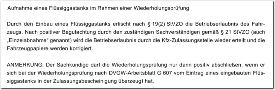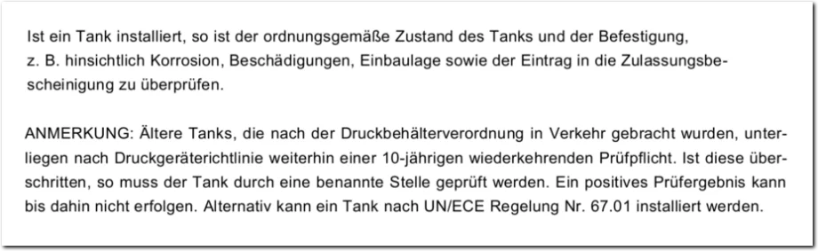 Prüfvorschrift für einen Flüssiggastank in Fahrzeugen